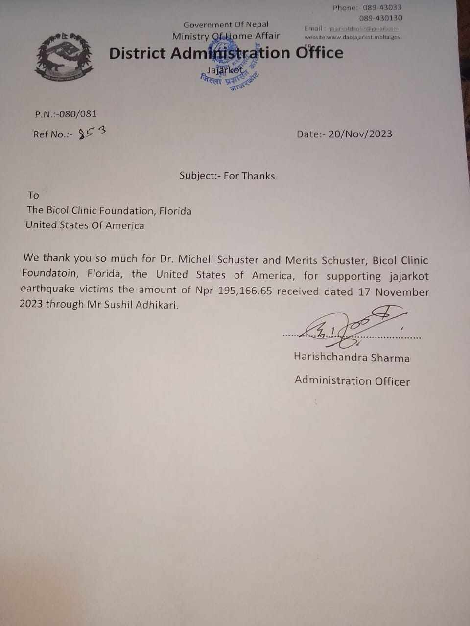 भुकम्प प्रभावित वस्तीहरुमा केही मल्हम लगाउने उद्धेश्यले Bicol Clinic foundation USA ले केही नगद र न्यानो ब्लाङ्केट उपलब्ध गराएको छ । जिल्ला प्रशासन कार्यालय, जाजरकोटको खातामा रु. १,९५,१६६।- (अक्षरुपी एक लाख पन्चानब्बे हजार एक सय छैसठ्ठी रूपैंया) जम्मा गरेको छ भने जाडोमा न्यानोको लागि २,००,०००/- बराबरको ९० थान ब्लाङ्केट बाराकोट गाउँपालिका वडा नं. २, लिम्सा, जाजरकोटमा वितरण गरेको छ । उक्त राहत सहयोग बिकोल क्लिनिक फाउण्डेशन, USA का president Dr. Michell Schuster, Miriam Schuster र Executive Director Jessica Schuster ले उपलब्ध गराएका थिए भने प्राप्त सामाग्री भूकम्प प्रभावित श्रेत्रमा वितरण गर्न नेपालबाट डा. नारायण मलहोत्रा, सुशिल अधिकारी र रामेश्वर श्रेष्ठले सहयोग गरेका थिए ।