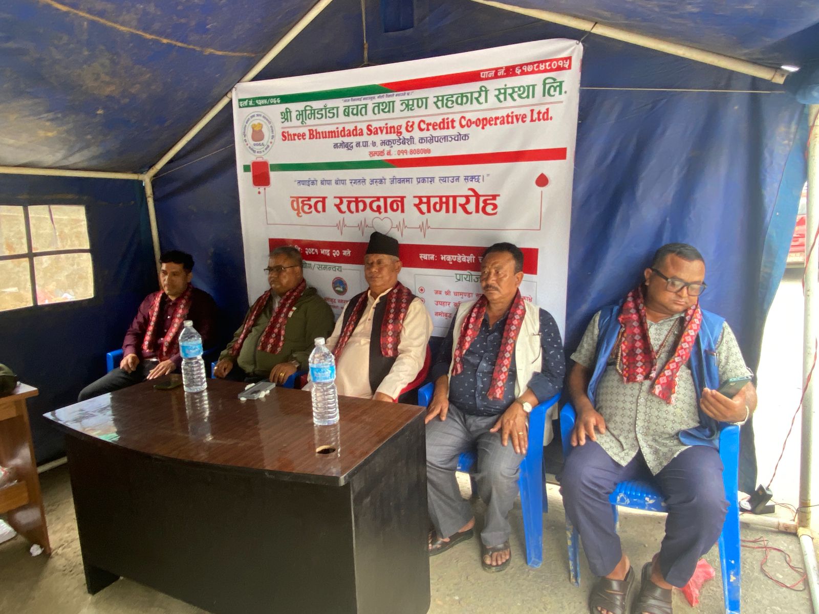 श्री भूमीडाँडा बचत तथा ऋण सहकारी संस्था लि.को आयोजनामा वृहत रक्तदान कार्यक्रम सम्पन्न भएको छ । भकुण्डेबेशीको चोकमा भएको उक्त कार्यक्रममा ४० जनाले रक्तदान गरेका छन् । नमोबुद्ध नगरपालिकाको समन्वय तथा नेपाल रेडक्रस सोसाईटी, काभ्रेपलाञ्चोक जिल्ला शाखाको सहयोगमा सम्पन्न भएको उक्त कार्यक्रममा नगर प्रमुख कुनसाङ लामाको प्रमुख आतिथ्यता रहेको थियो । प्रमुख लामाले रगत निकाल्ने सामाग्री रेडक्रस काभ्रेका सभापति रघुनाथ हुमागाईंलाई हस्तान्तरण गरी र्कायक्रमको उद्घाटन गरेका थिए ।