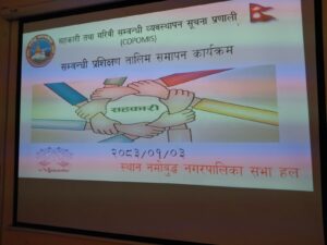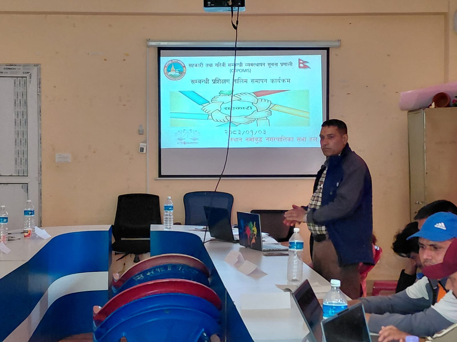 नमोबुद्ध नगरपालिका सहकारी शाखाको पहलमा सहकारी क्षेत्रलाई प्रविधिमैत्री, पारदर्शी र व्यवस्थित बनाउने उद्देश्यसहित सञ्चालन गरिएको CoPoMIS (Cooperative Management Information System) सम्बन्धी तीन दिने तालिम सम्पन्न भएको छ। तालिम नगरपालिकाको सभाहलमा उत्साहजनक सहभागितासहित आयोजना गरिएको थियो।